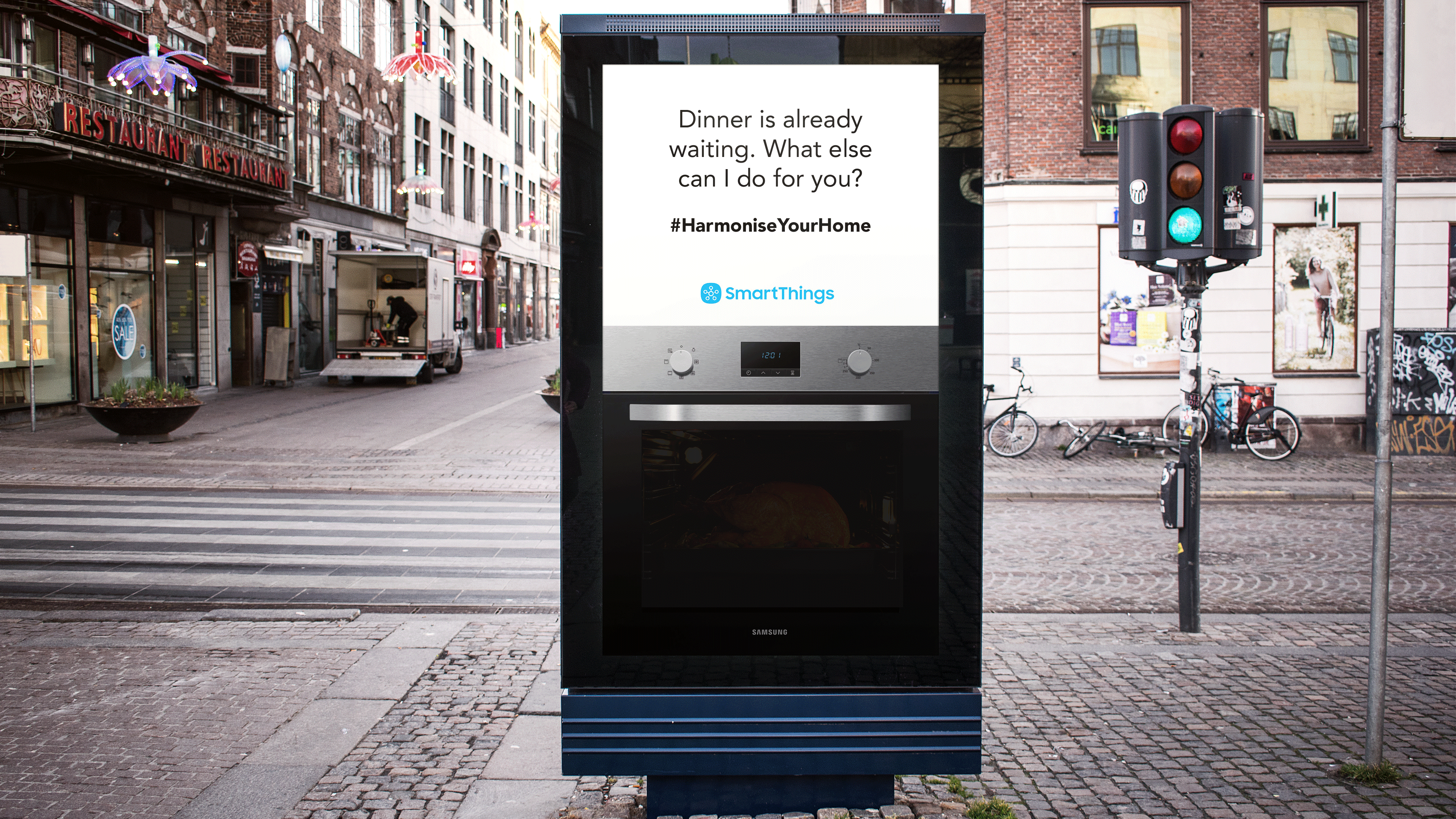Smart city lights, that come to life when you’re standing next to them, displaying all kinds of Samsung SmartThings technology appliances going their job: a washing machine, an oven, a fridge, together with a copy written from the point of view of the device.